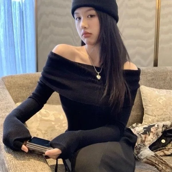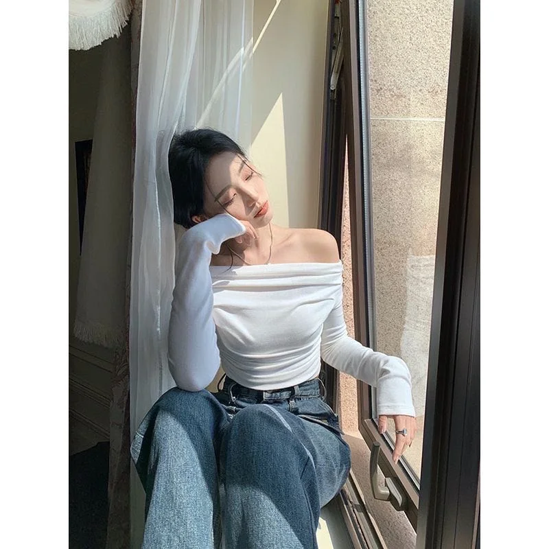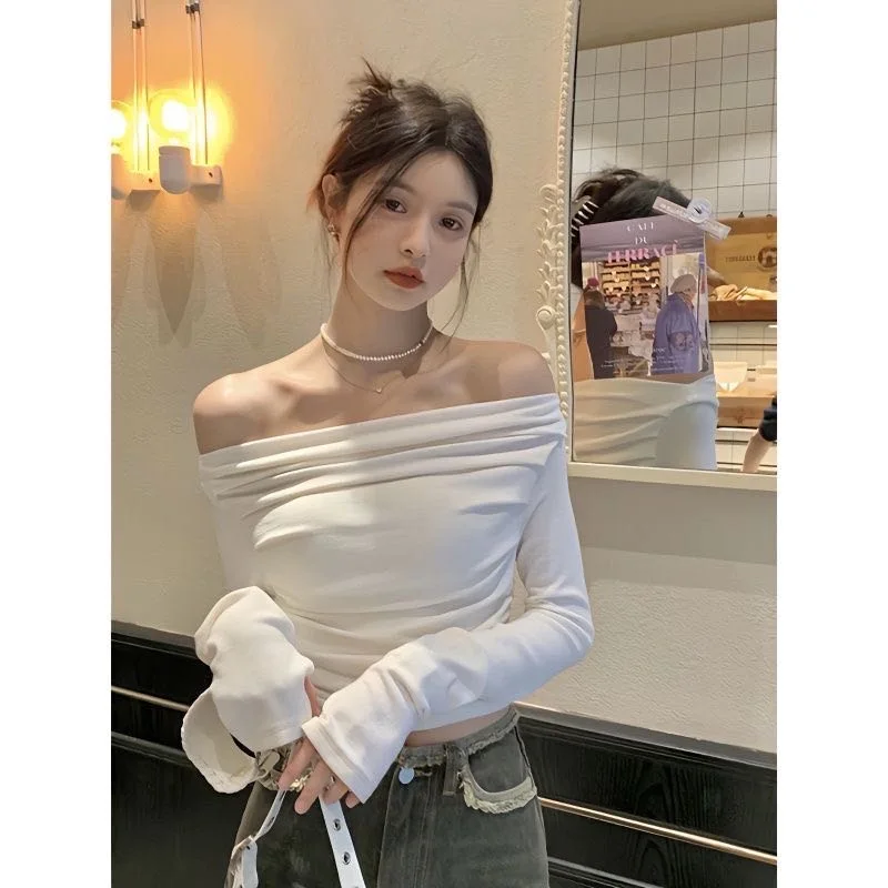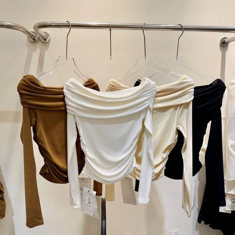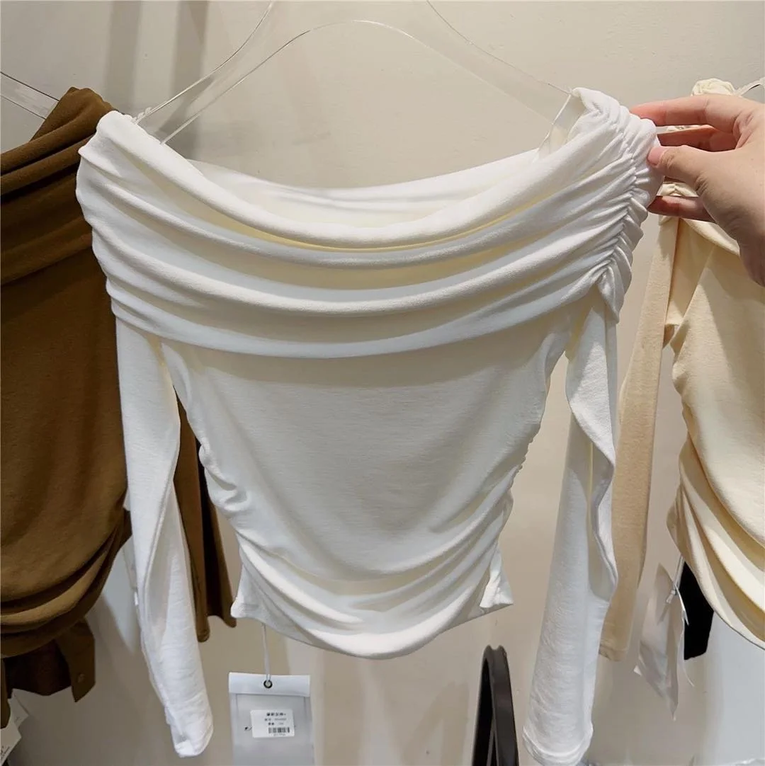 Dating Pleated Cross Shoulder Coat Women Waist Slimming Bottom T-Shirt Solid Color Everything Top