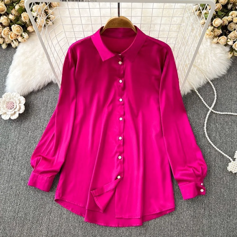 Fashion Casual Satin POLO Collar Single Breasted Long Sleeve Irregular Shirt Top Women Fall